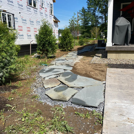 This new build in Wilton has been receiving an entire landscape overhaul! On the side of the house leading to the backyard, we've installed a custom natural bluestone walkway, plants galore, as well as stone and mulch to add texture and contrast to the landscape. The backyard, if you can imagine, was a completely blank slate! The owners envisioned a "zero grass" yard and that's exactly what we've given them! The owners had a teahouse and barrel sauna added, which allowed us to create natural bluestone pathways to each area of the yard. We also built a custom natural bluestone fire pit area. We've created designated planting zones of river rounds, where we will add color and texture that adds a natural flow to the design and evokes a sense of calm. Up to the teahouse, we've installed local Saratoga granite steps. Stay tuned for some stunning perennials!