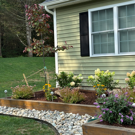 The front yard received a whole new makeover! We added all new plants to the bare planter boxes, added river rounds along the sidewalk and in front of the planter boxes, and added a few decorative rocks in the beds for some added texture.